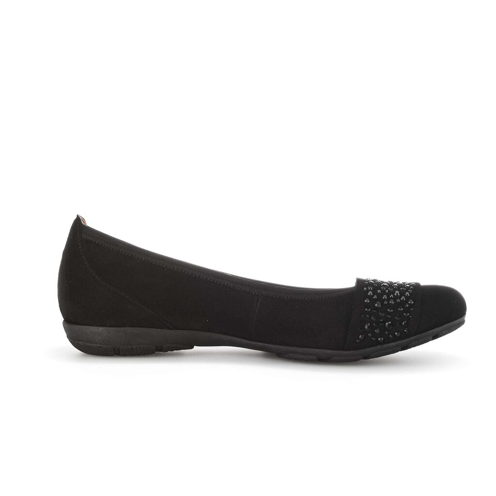 Dámské baleríny Gabor 54.167.17 v černé barvě jsou dokonalou kombinací elegance, pohodlí a precizního zpracování, které oceníte každý den. Vyrobeny z jemné semišové kůže, tyto baleríny vás zaujmou svou kulatou špičkou, kterou zdobí elegantní pásek s blyštivými kamínky. Lem opatřený paspulkou zajistí, že boty perfektně přilnou k vašemu chodidlu, takže se budete cítit pohodlně i při celodenním nošení.