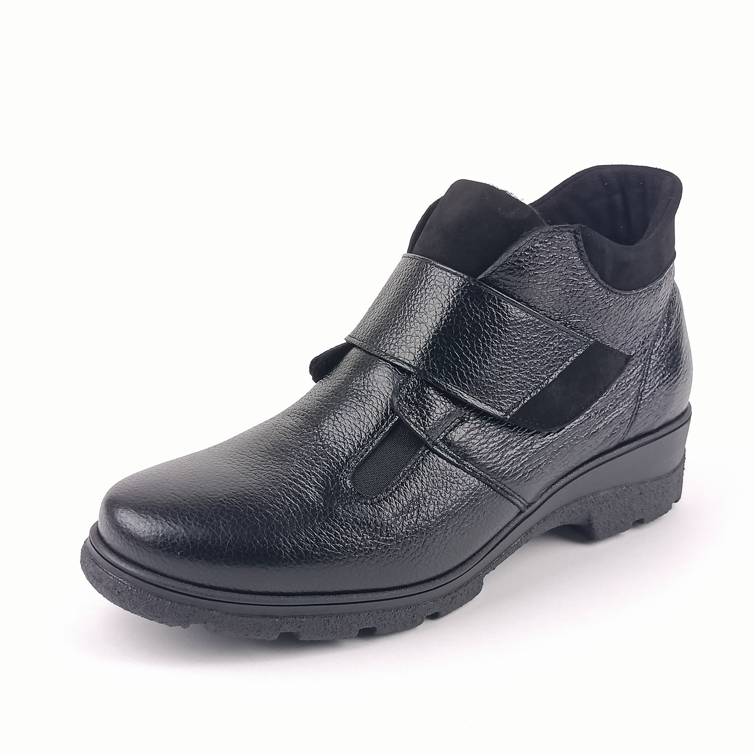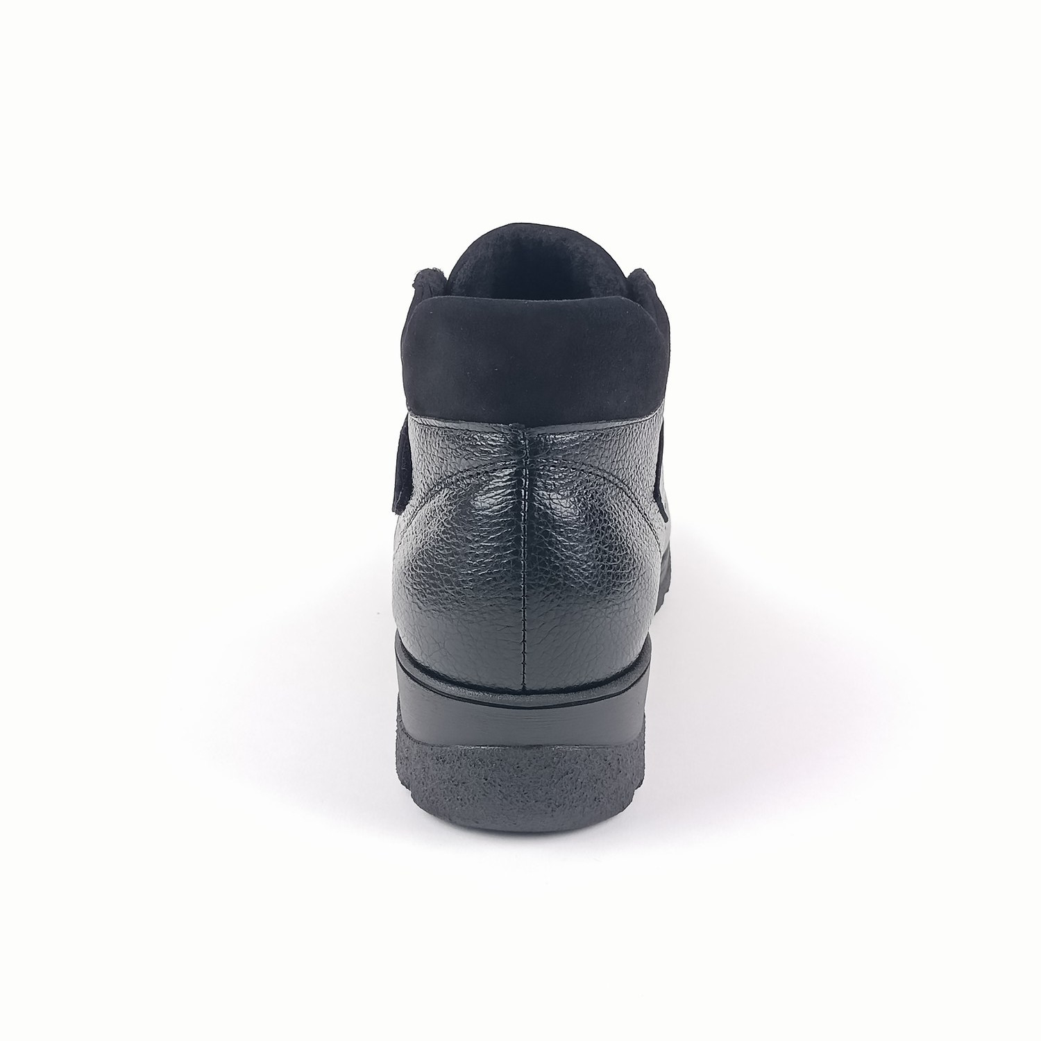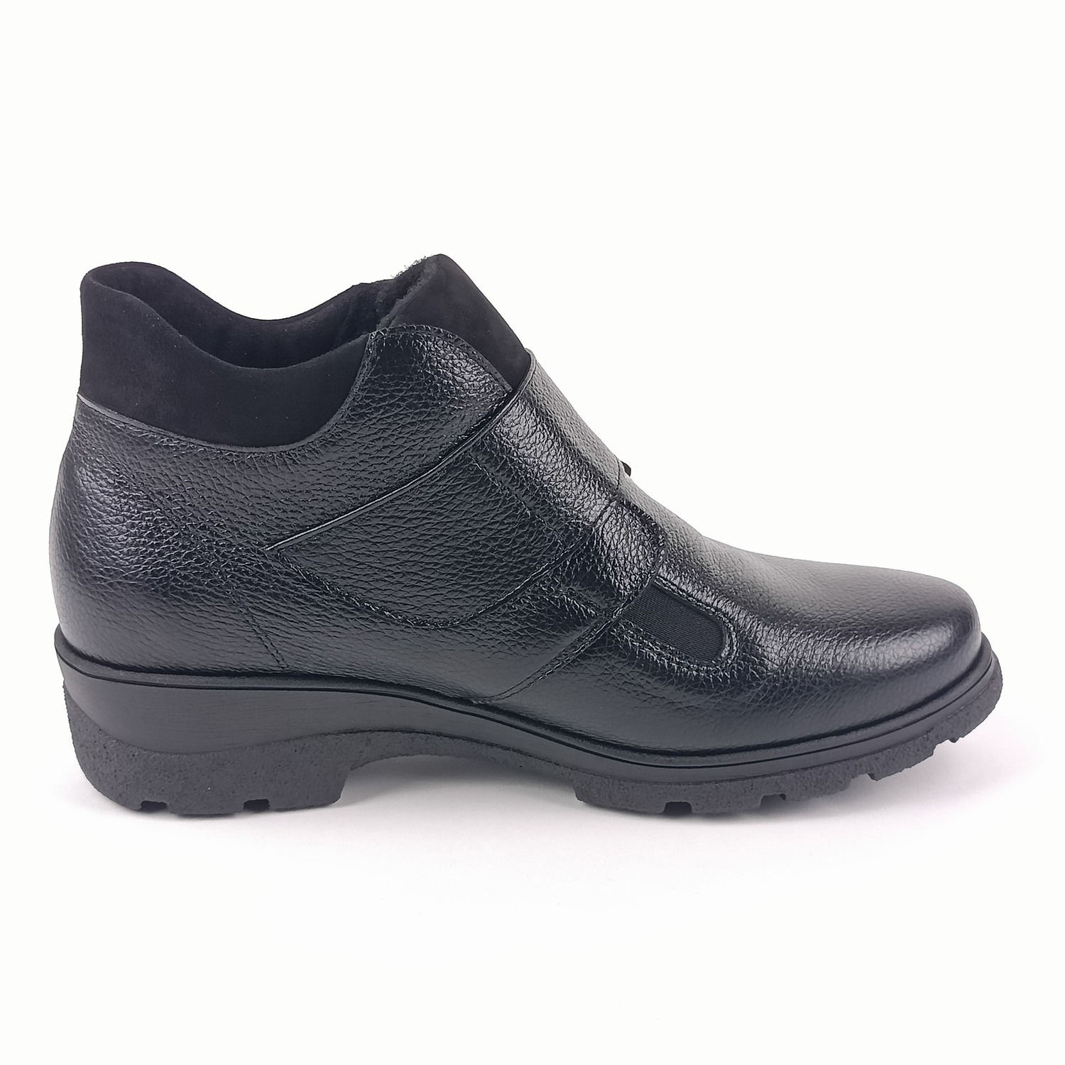 Svršek je z kombinace hladké a broušené kůže, což botám dodává elegantní vzhled s jemným kontrastem textur. Zapínání na suchý zip je praktické a umožní vám rychlé a pohodlné nazouvání bez zdlouhavého šněrování. Vnitřní textilní podšívka a měkce vyměkčená stélka zaručí příjemný komfort i při delším nošení.
