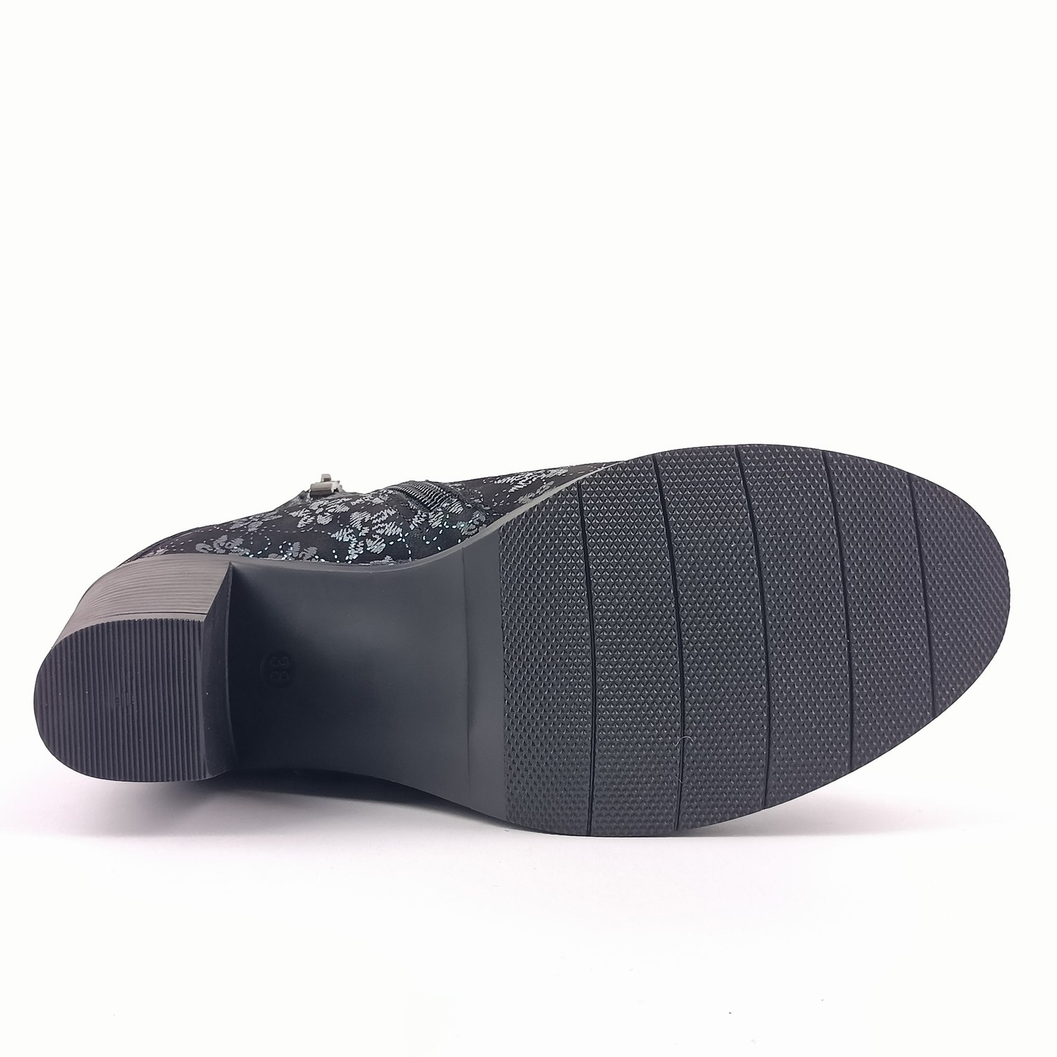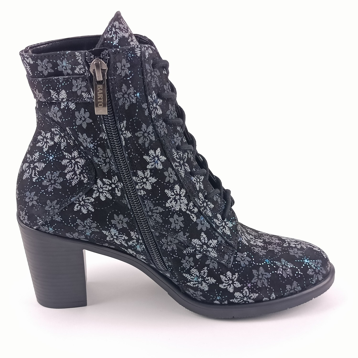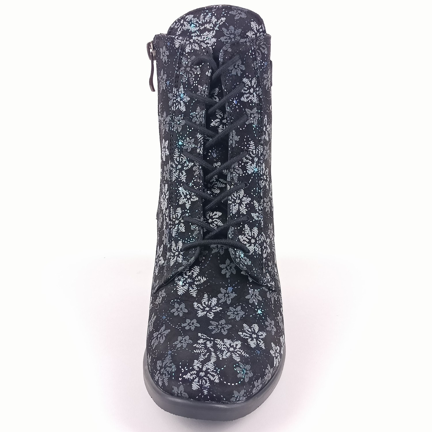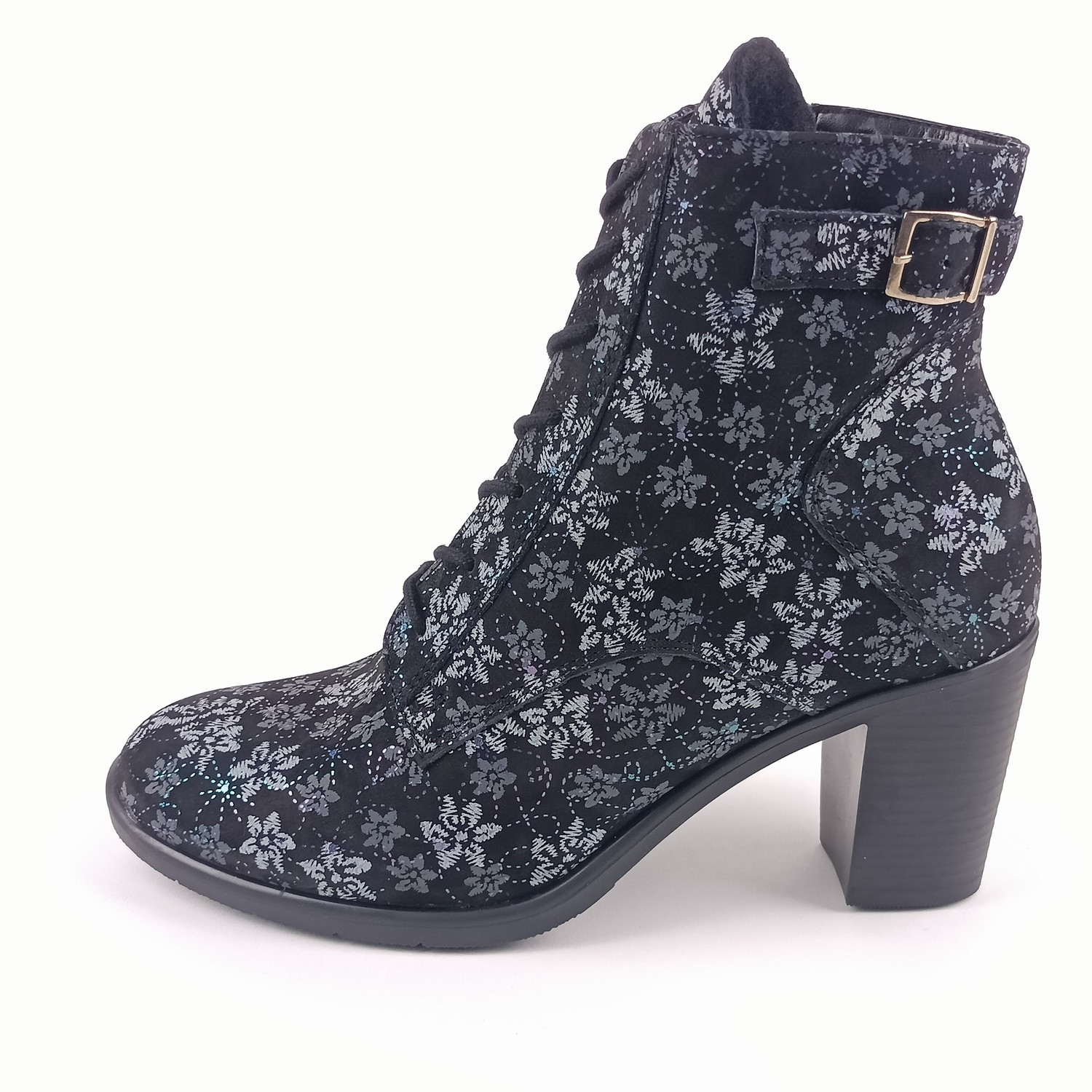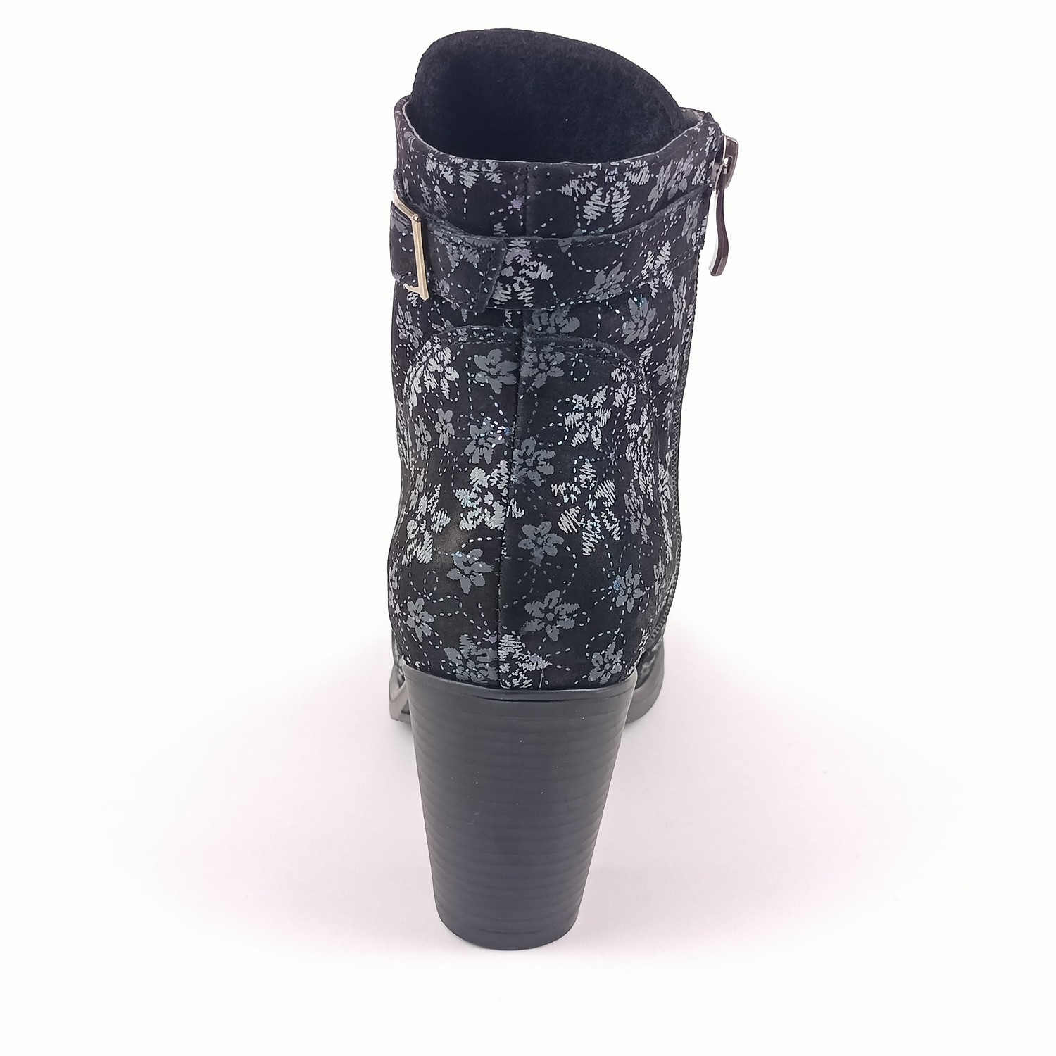 Svršek z kvalitní nubukové kůže zdobí jemný květinový potisk v odstínech šedi, doplněný o decentní duhově metalické ornamenty, které botám dodávají jedinečný šmrnc. Kulatá špička, klasické šněrování a praktický zip na boku zajišťují pohodlné obouvání i výborné přizpůsobení noze. Vzadu navíc najdete kožený řemínek s možností regulace obvodu.