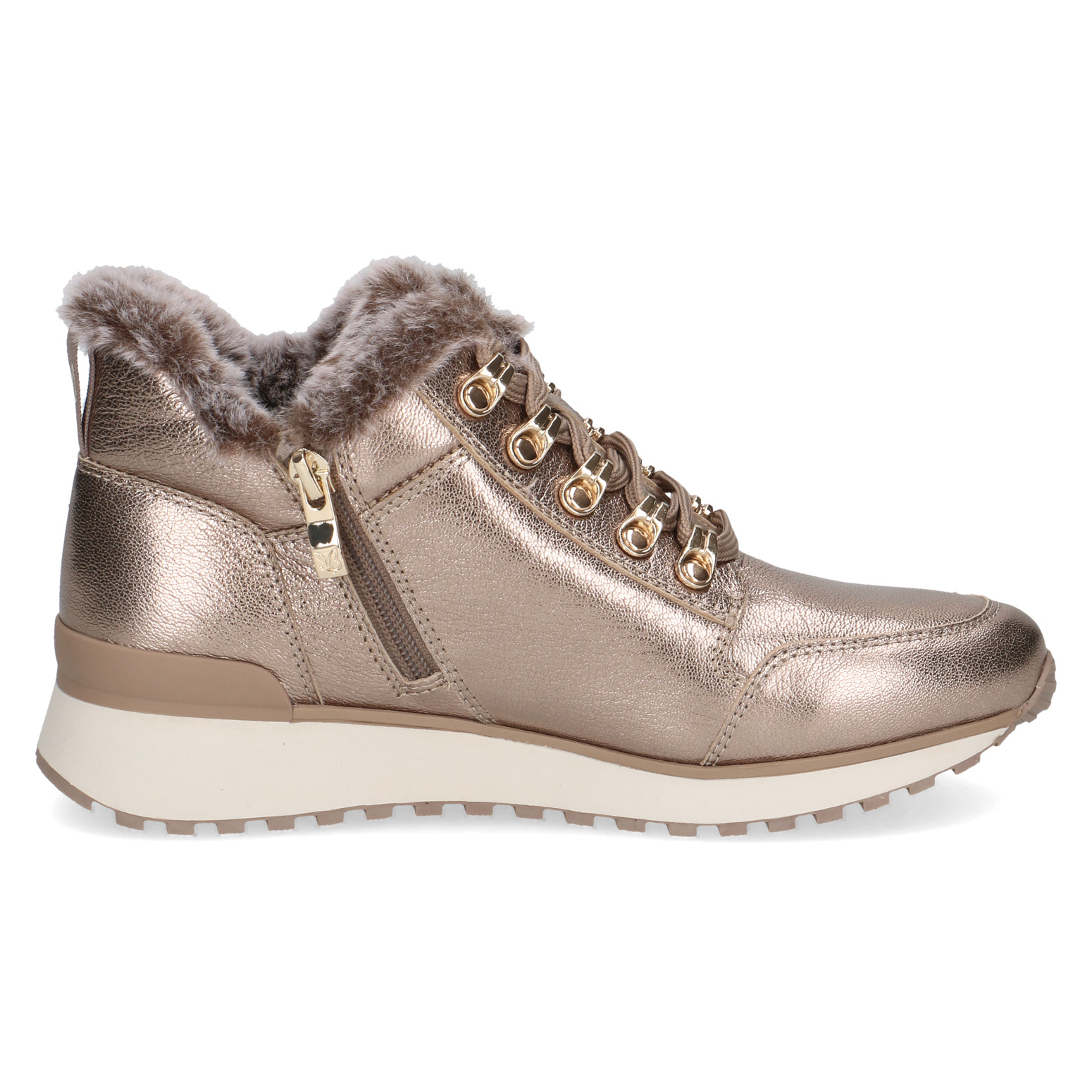 Dámské kotníkové boty Caprice 9-26211-41 303 ve zlaté barvě jsou ideálním společníkem pro chladné zimní dny. Díky svršku z pravé kůže a zateplené podšívce s měkkým kožíškem zajistí maximální pohodlí a teplo při každodenním nošení. Jejich sportovní střih a elegantní design se skvěle hodí jak k městským outfitům, tak i k volnočasovým aktivitám.