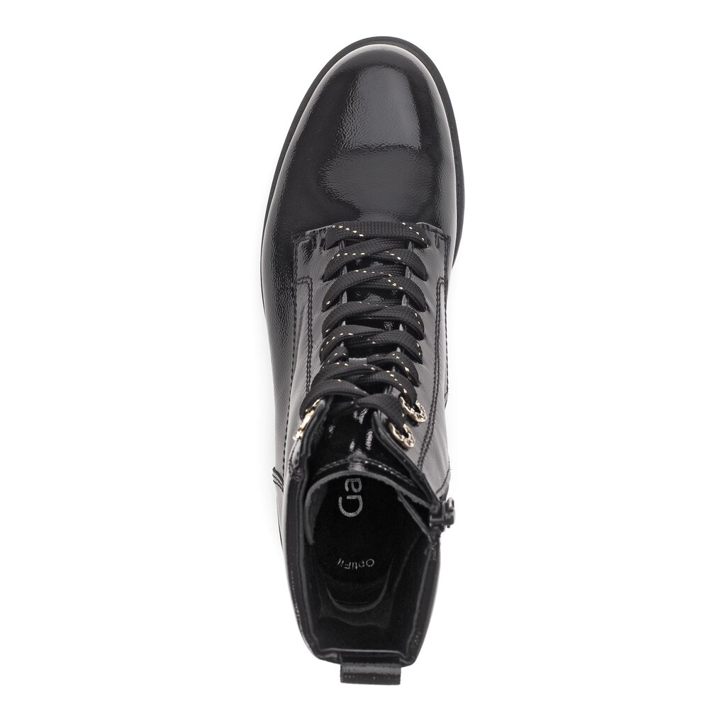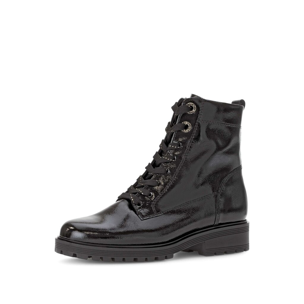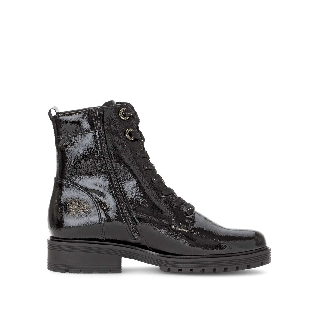 Dámské kotníkové boty Gabor 52.765.97 v černé barvě vás zahřejí v chladných zimních dnech a zároveň přidají vášemu outfitu nádech elegance. Tento model, vyrobený z kvalitní lakované kůže s jemným mačkaným efektem, zaujme svým luxusním vzhledem a černým odstínem s metalickým nádechem.