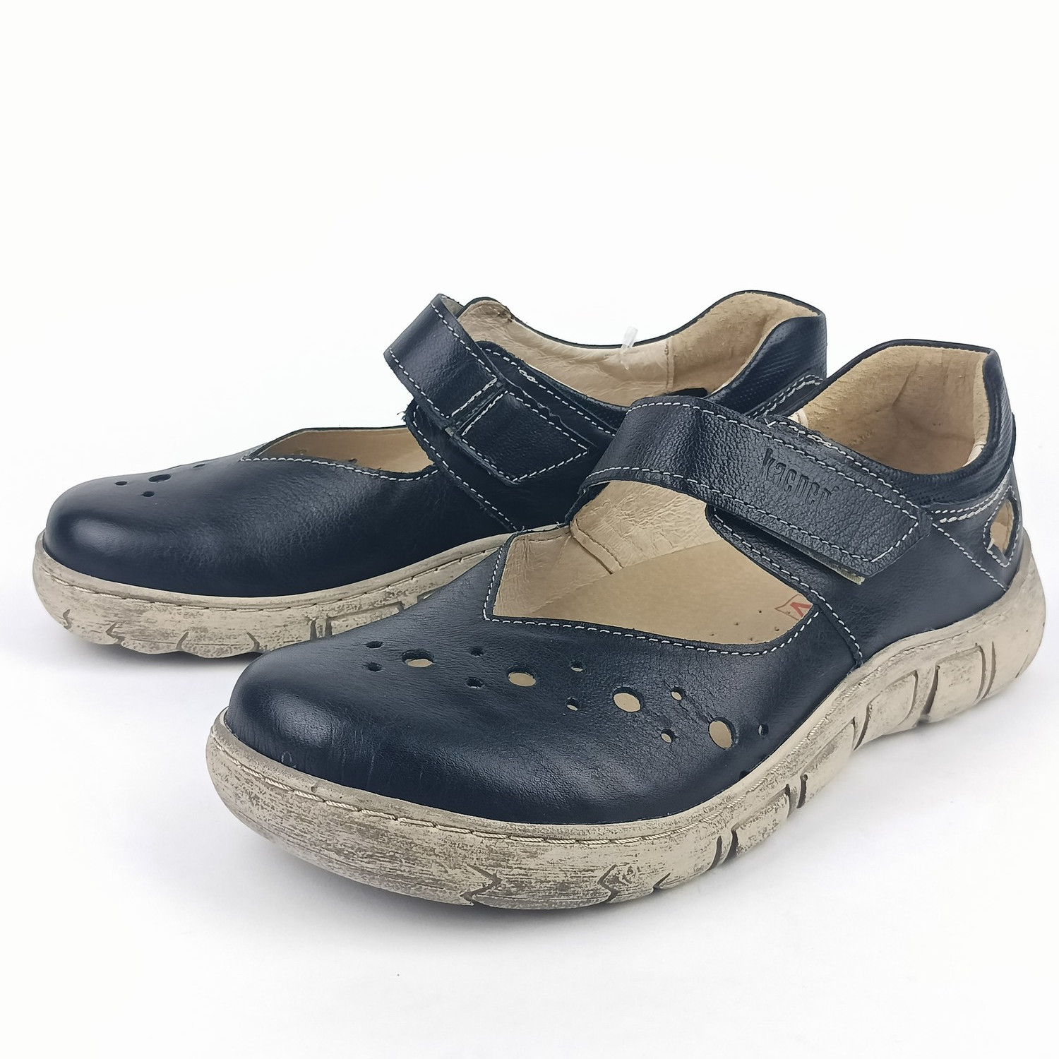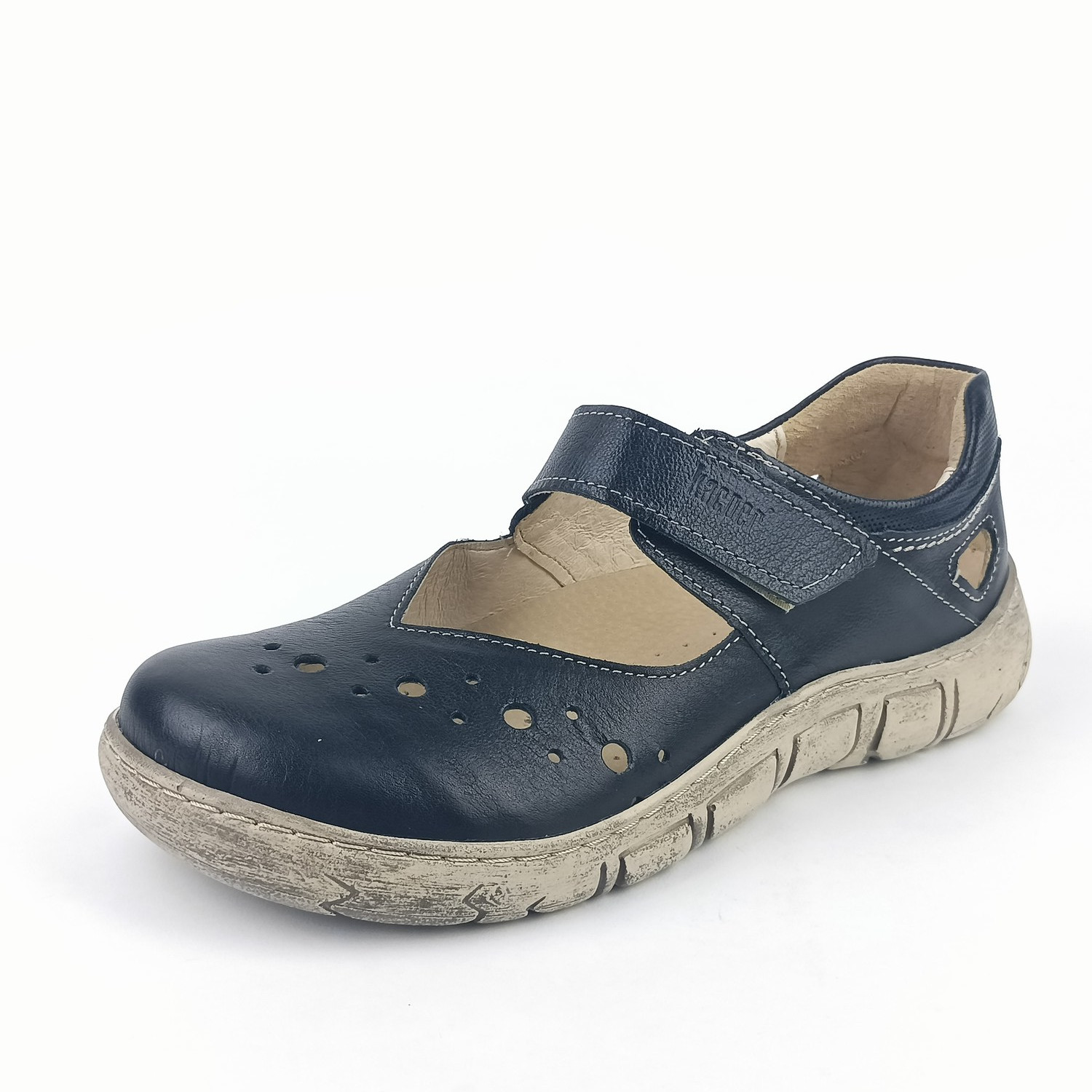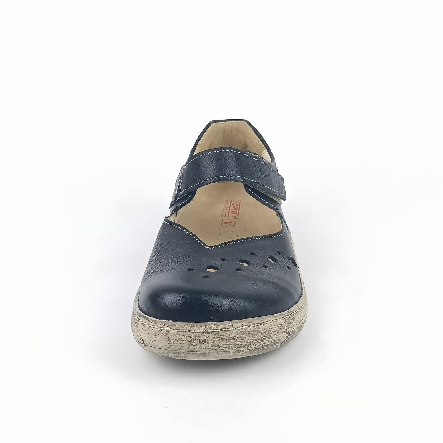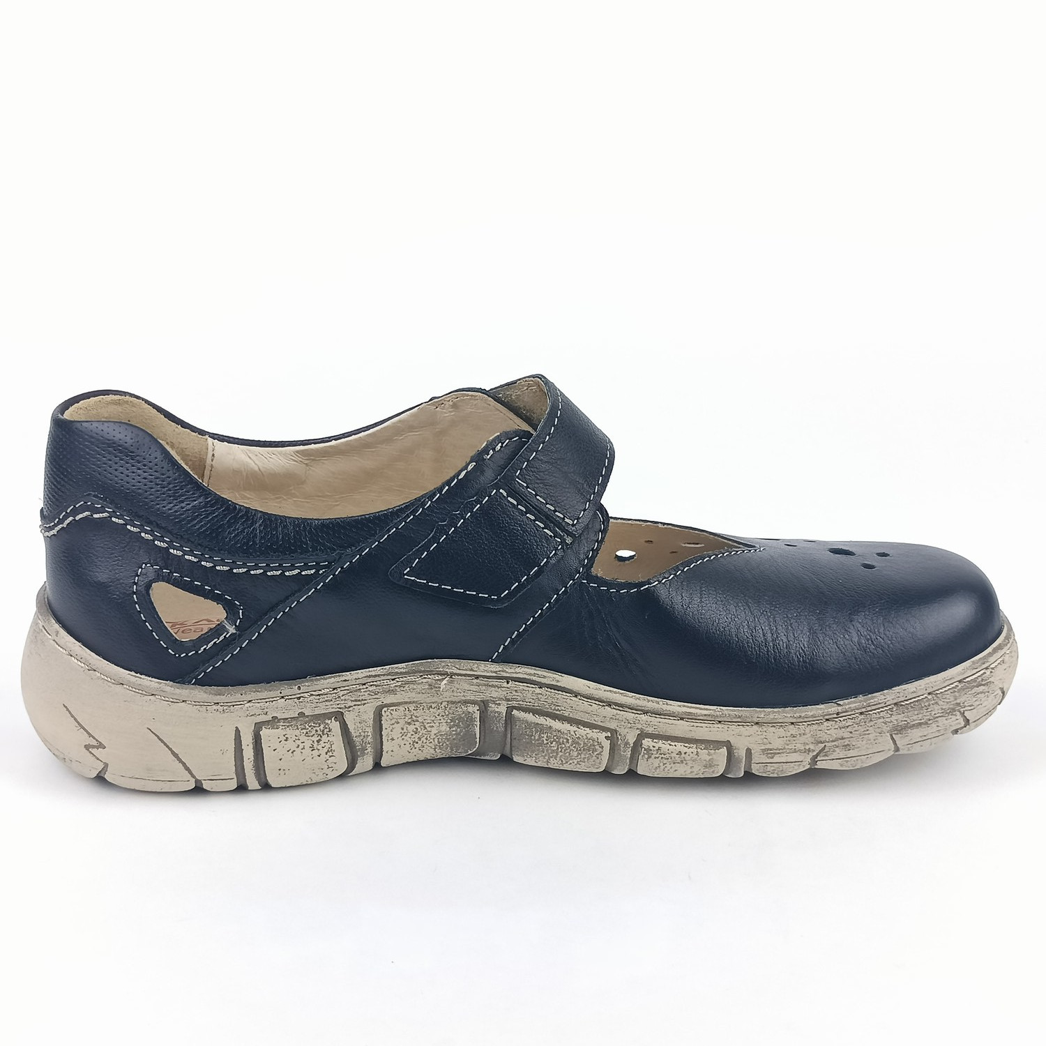 Nártový pásek na suchý zip zajišťuje snadné obouvání i dokonalé přizpůsobení noze. Vnitřní podšívka je celokožená (špička jemně podšitá textilií), díky čemuž se obuv příjemně nosí i během delšího dne. Vyjímatelná měkká stélka s perforací v přední části a změkčenou patní zónou zajišťuje zdravý a měkký došlap.