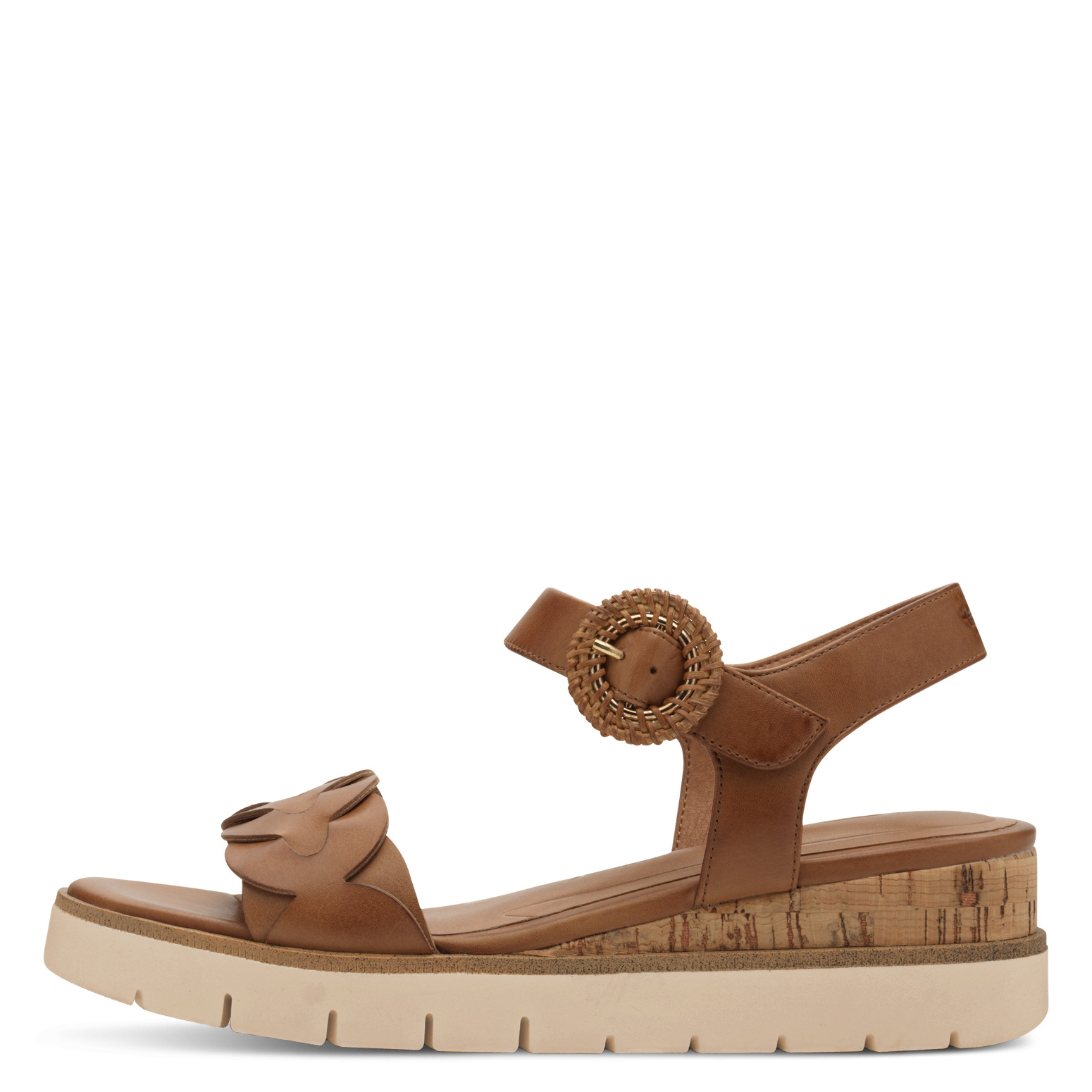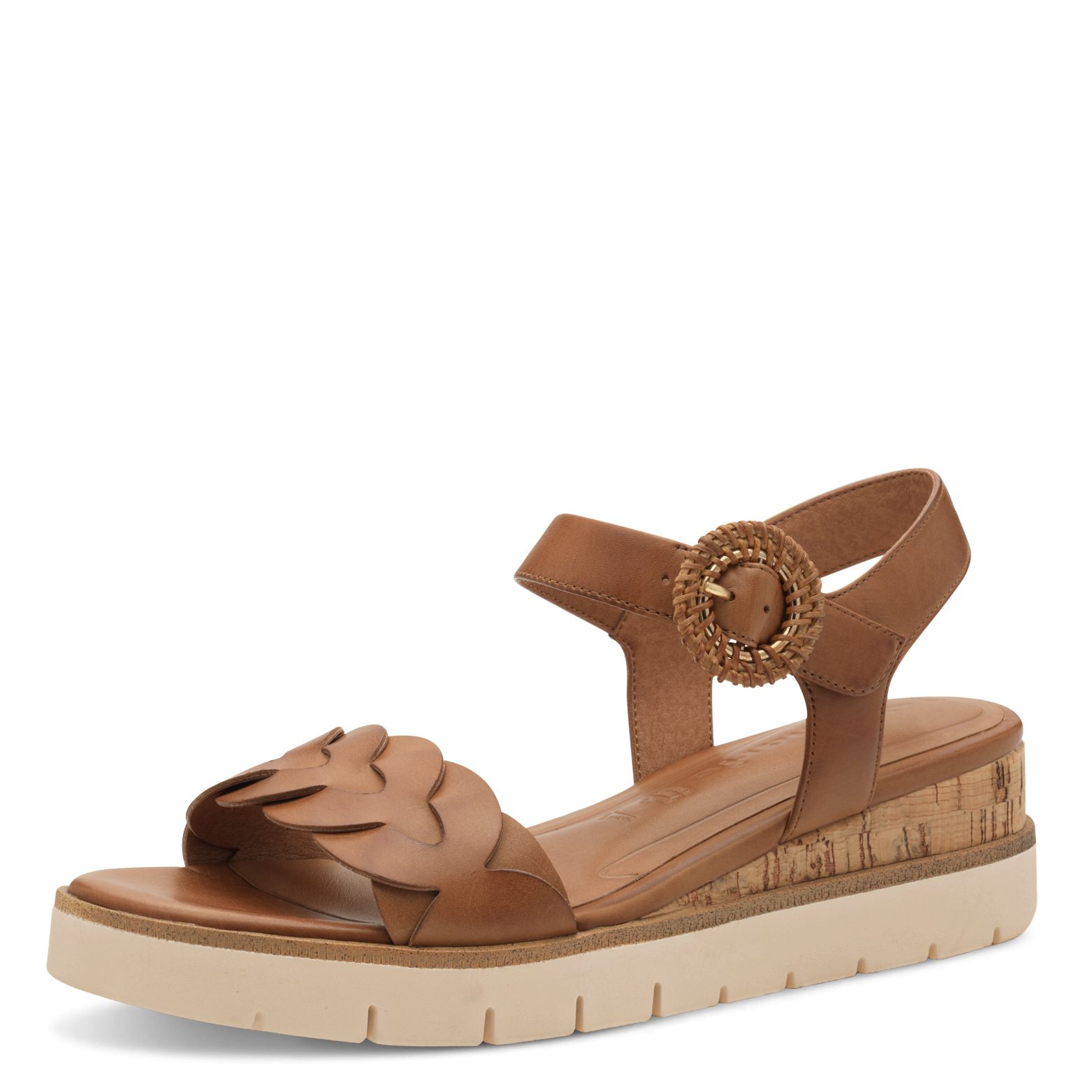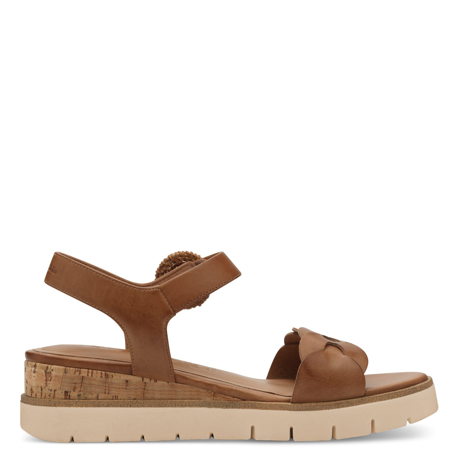 Jemně zvýšený klínek o výšce přibližně 5 cm dodá postavě lehkost a zároveň zajistí stabilní a pohodlný došlap. Svršek z hladké kůže působí elegantně a přirozeně se přizpůsobí noze, zatímco kožená podšívka zvyšuje komfort i při celodenním nošení. Prostorný kulatý tvar špičky nabízí dostatek místa pro chodidlo a přispívá k celkové pohodě při chůzi. Stélka s paměťovou pěnou Touch-It se přizpůsobí tvaru nohy, změkčí každý krok a uleví chodidlům i během dlouhého dne. Praktické zapínání na suchý zip umožňuje snadné obouvání a individuální nastavení. Podešev s jemným korkovým dekorem podtrhuje letní charakter sandálů a dodává jim přirozený šmrnc.