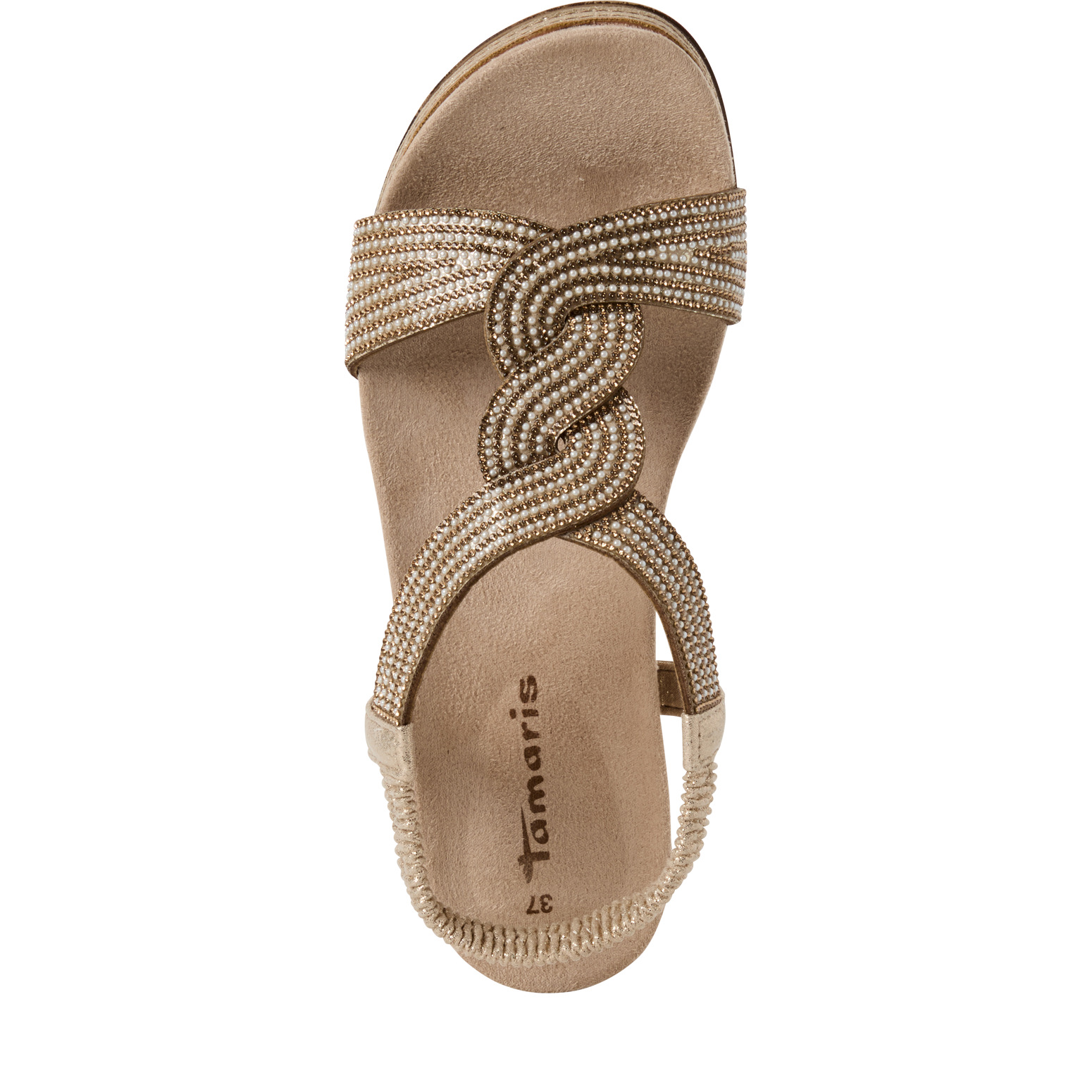 Textilní svršek je po celé ploše bohatě zdobený a vytváří efektní zvlněný a propletený vzhled, který zaujme na první pohled. Díky pružnému patnímu pásku se sandály velmi snadno obouvají a skvěle se přizpůsobí noze, což oceníte při každodenním nošení. Měkká, tvarovaná stélka potažená broušenou textilií poskytuje příjemný komfort a patní absorbér pomáhá tlumit došlap při chůzi. Flexibilní podešev s decentním metalickým proužkem dodává sandálům moderní vzhled a zároveň zajišťuje lehkost a stabilitu při každém kroku.