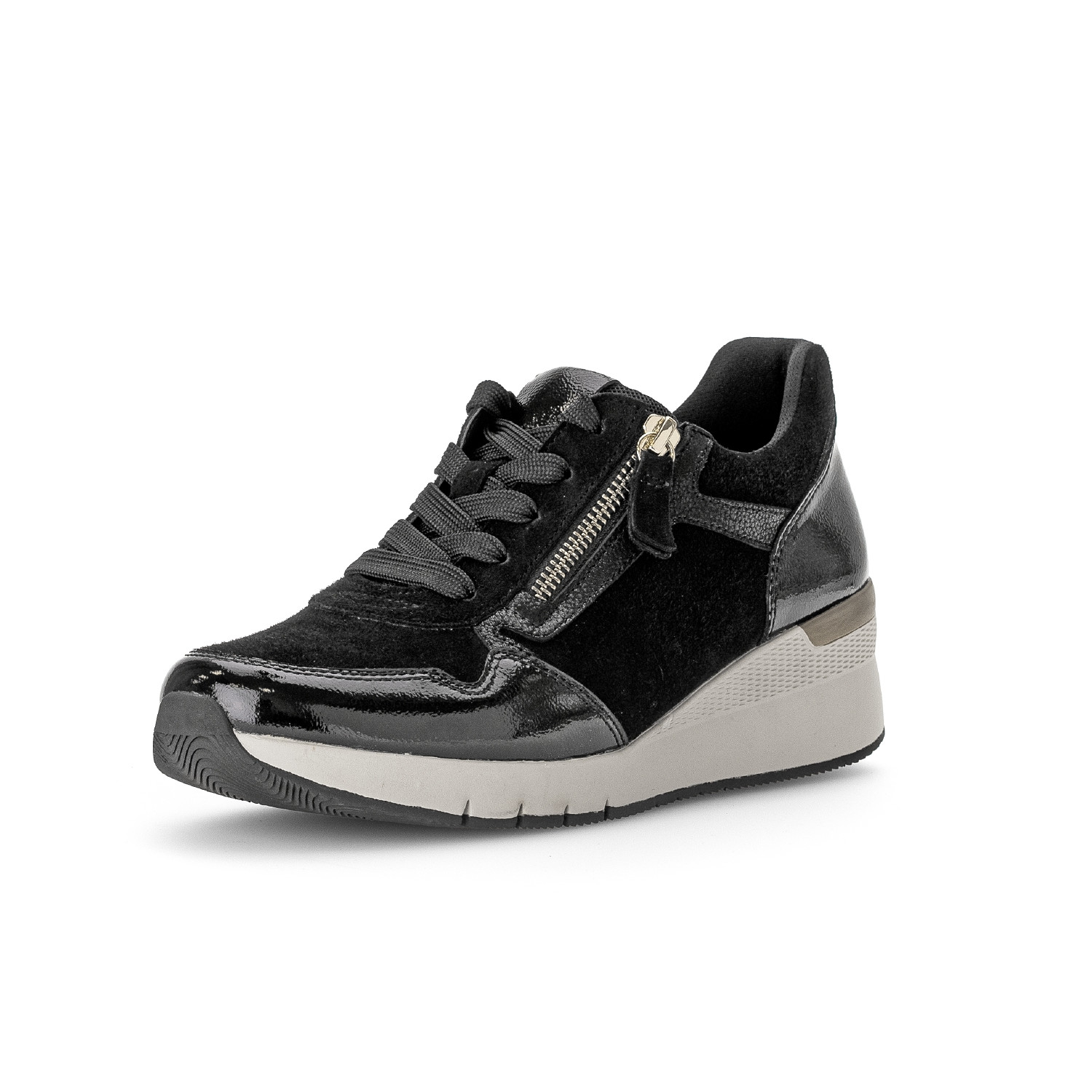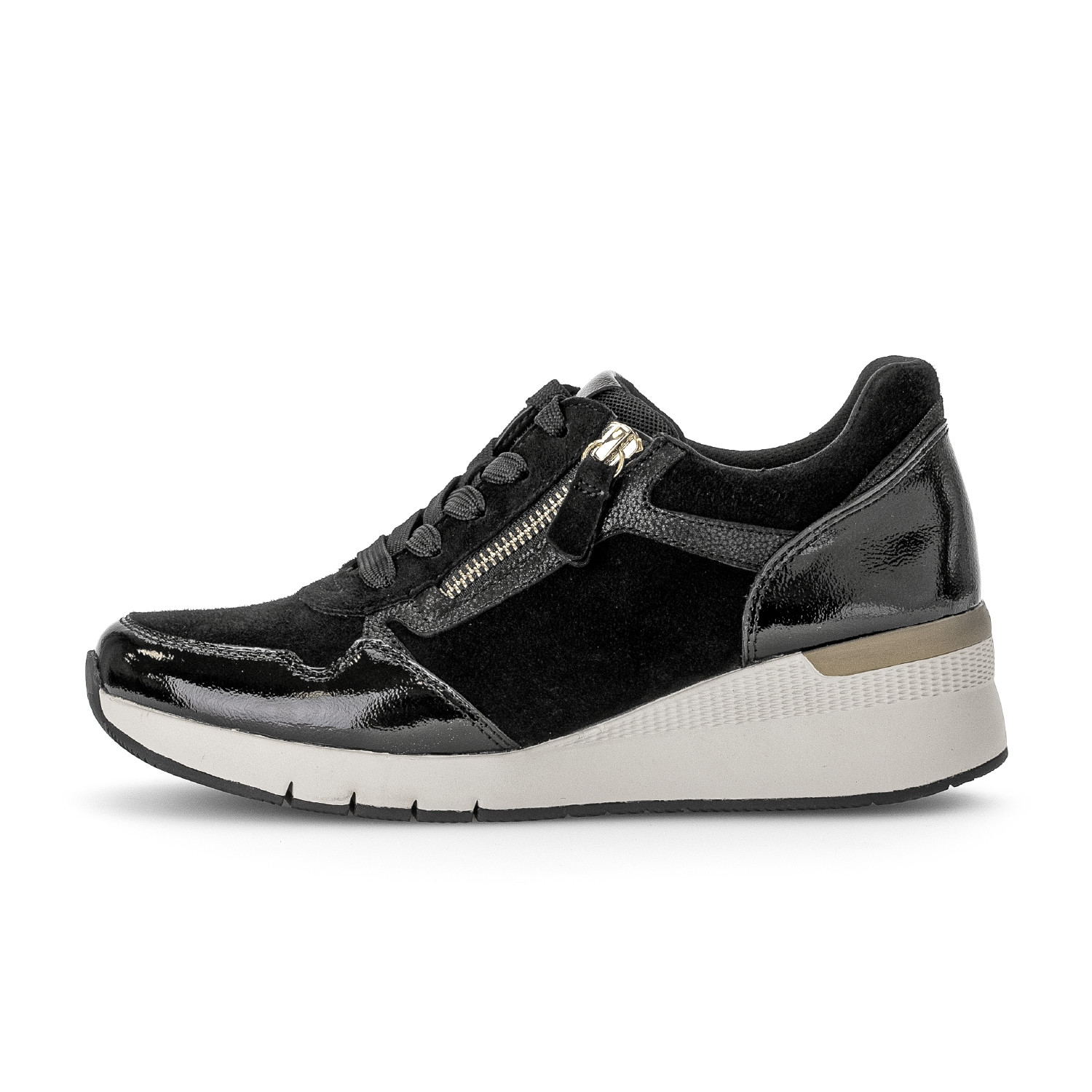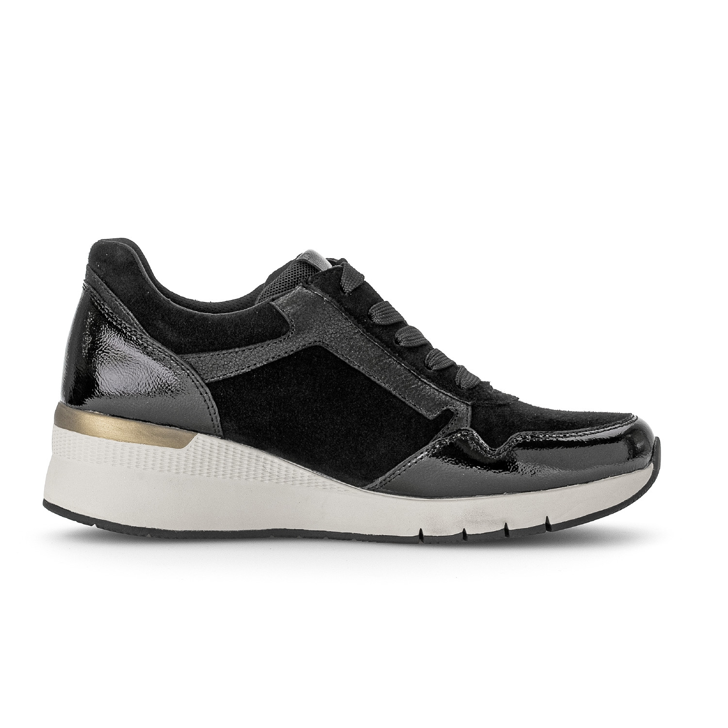Dámské tenisky na klínku Gabor 76.508.37 černé – elegantní komfort do města i na celý den. Styl, pohodlí a funkčnost – tyto tenisky od značky Gabor v sobě spojují všechny klíčové vlastnosti obuvi, kterou si zamilujete na první obutí. Elegantní černá barva spolu s kombinací lakované a semišové kůže dodává modelu moderní vzhled, který skvěle zapadne do vašeho každodenního šatníku.